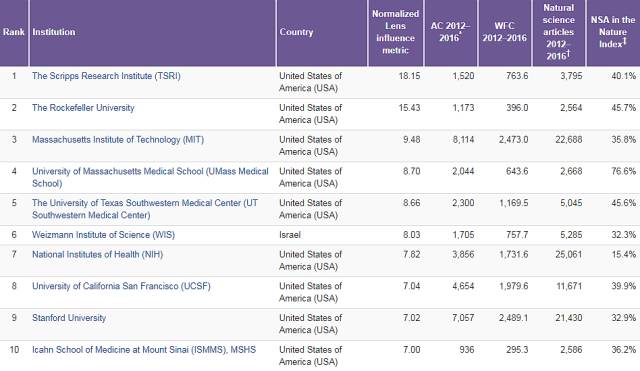 根据归一化加权分数(normalized weighted fractional count),Lens 指标最高的一些机构,发表的论文自然指数也很高,这表明其论文质量很高: