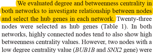 然后分析第二层网络的拓扑学结构,从中筛选出 hub 基因(图中绿点表示最初的 13 个种子基因,蓝点表示第一层的基因)。在构建过程中,随着基因数量的不断增加,最先选出的 13 个种子基因未必就是后来的 hub 基因。文中还设置了对照组,并详细讲述了这 13 个种子基因的筛选方法。因为整个分析过程都是建立在生信分析的基础上,属于完全架空的,所以整个研究过程十分讲究逻辑上的严谨性。